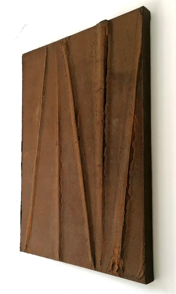 Exclusive textured sculpture by visionary artist Julian Arnaud. Why are Julian Arnaud‘s creations unmatched by other artists? Because he shapes his ideas with original materials such as cement and plywood. This remarkable piece evokes the timeless beauty of nature’s geological processes, showcasing vertical textures that recall fossilized wood and ancient organic forms, demonstrating the artist’s mastery in transforming unconventional materials into sophisticated art.