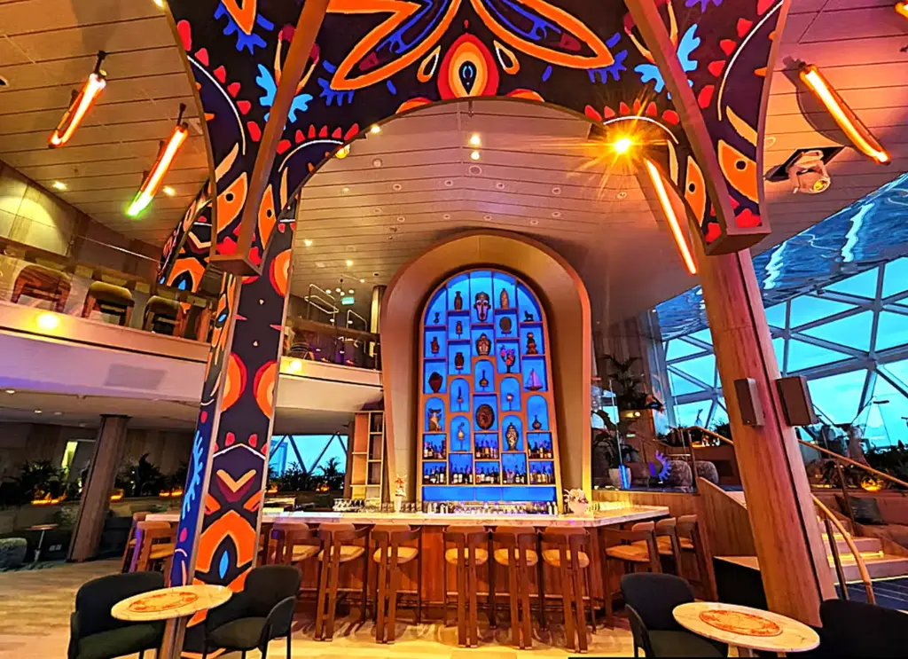 This bespoke advanced LED display dominates the main bar area, creating an impossible-to-ignore focal point that redefines the traditional cruise bar experience. Standing behind the bar’s elegant arch-shelving system, this digital canvas transforms the simple act of ordering a drink into special moment. The 5.6-meter height creates an almost cathedral-like sense of awe, while the 2.5-meter width ensures optimal viewing from every seating position. Whether you’re sat, the visual experience adapts to your perspective.